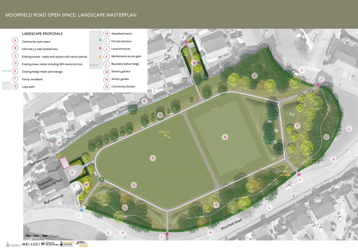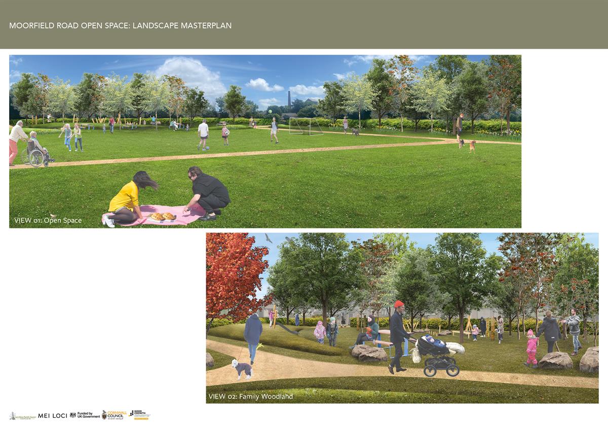 Moorfield Road Open Space Is a valuable community green space in the centre of Pool, adjacent to Treloweth Community Hall. The open space currently includes a large area of open field, a small garden area, a war memorial, seating and football goals, alongside mature shrubs and trees to the perimeter.